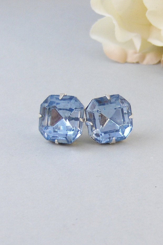 A glamorous light sapphire pair of blue cushion princess shaped vintage rhinestones have been set in a silver settings. These earrings have been made with silver plated hypoallergenic posts.