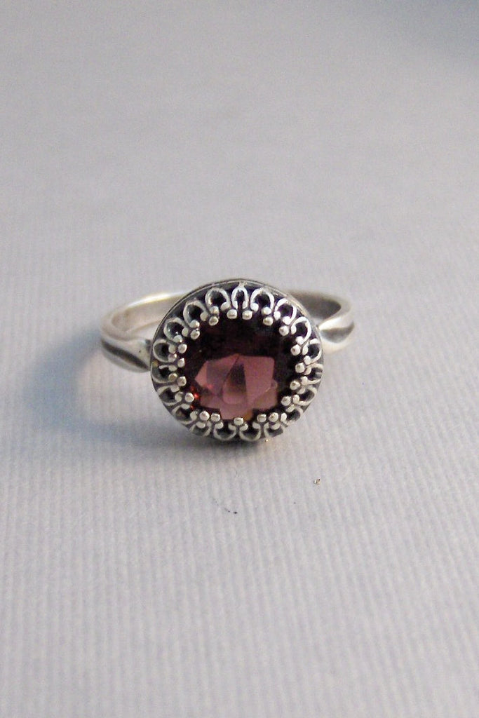 A pretty vintage Garnet Swarovski cab, has been added to a pretty antiqued silver ring, with a crown setting. This ring is self adjustable, and wraps around any finger and is beautifully elegant. This vintage stone measures 12mm.