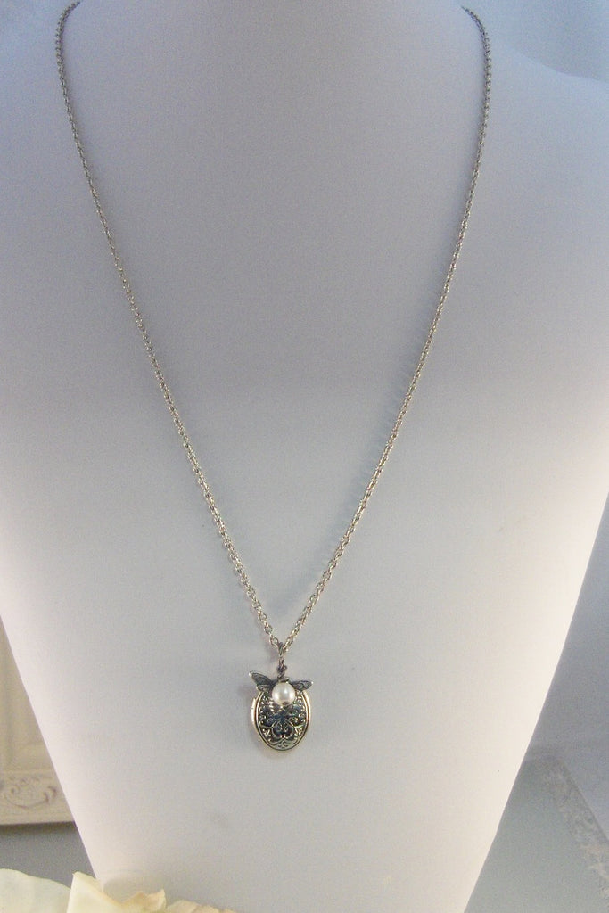 I have added a tiny little antiqued silver bee to a dainty little antiqued silver locket, you may choose a pearl or the birthstone of your choice. Both pieces hang gently from a twisted antiqued silver ring.