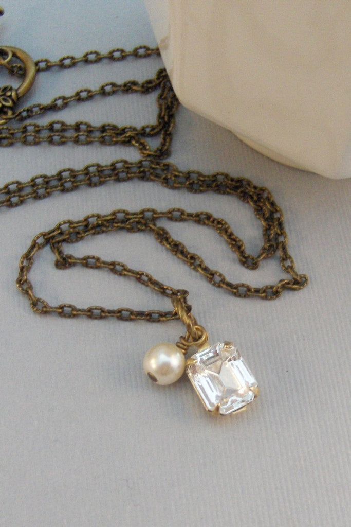 A lovely edition to any wardrobe or for any Bridesmaid. This little princess cut vintage glass diamond stone. Has been set in a pretty antiqued brass setting. A tiny pearl or birthstone has been added to this stone and adorns the lovely chain with an antiqued brass twisted ring.